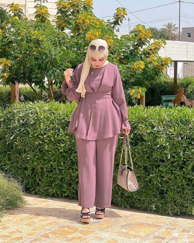 - سوت محجبات كلاسيكي، يتكون من قطعتين وهو عبارة عن بلوزة واسعة تصل برباط عن الخصر وأزرار مغلقة، والديل مروحة، أما الجيب فهي واسعة وبكلوش واسع لزيادة الراحة وحرية الحركة.